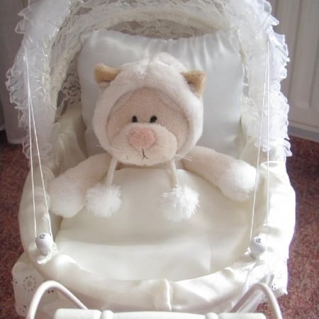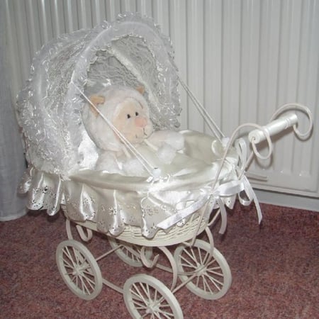Weil ich keine Puppen sammle, dafür aber bestimmte Stofftiere, habe ich meine Schneekatze (die mir mal ein sehr lieber Freund schenkte) in den Wagen gesetzt. Ich finde, die Schneekatze der Firma "Nici" passt dort auch prima rein. :o)